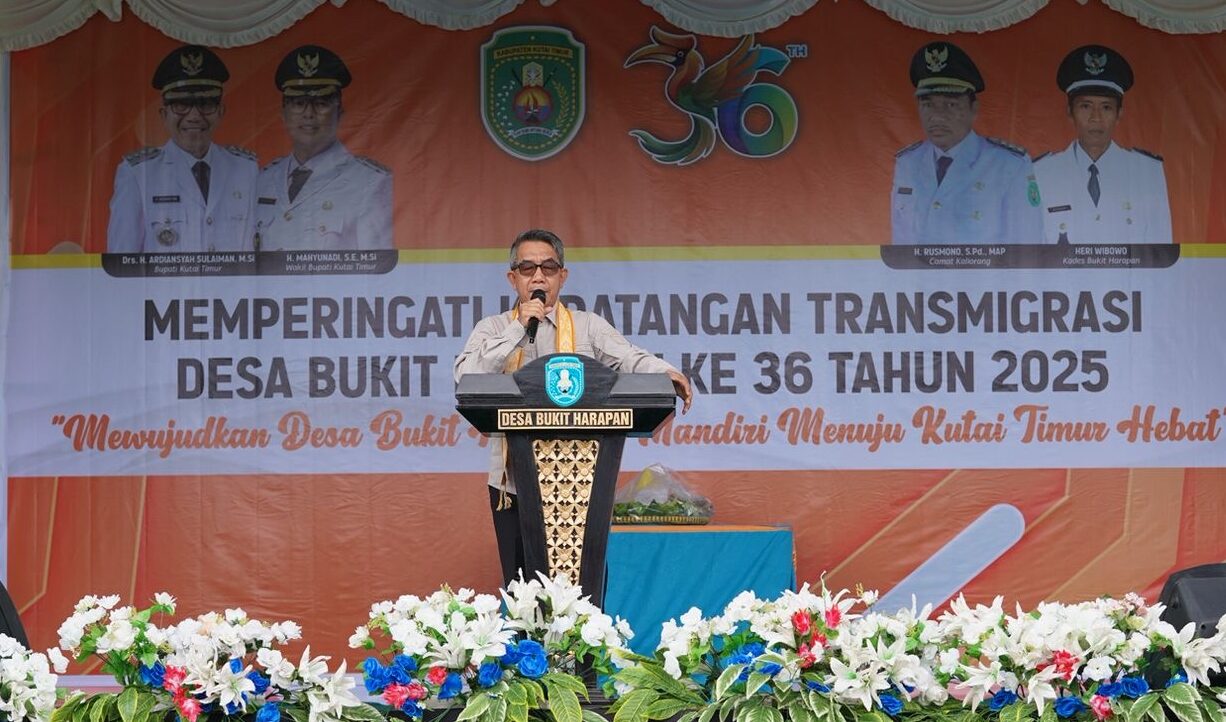 Kutipopini.com – Bupati Kabupaten Kutai Timur (Kutim), Ardiansyah Sulaiman, turut hadir dalam peringatan 36 tahun transmigrasi Desa Bukit Harapan, Kecamatan Kaliorang, Rabu (19/11/2025).